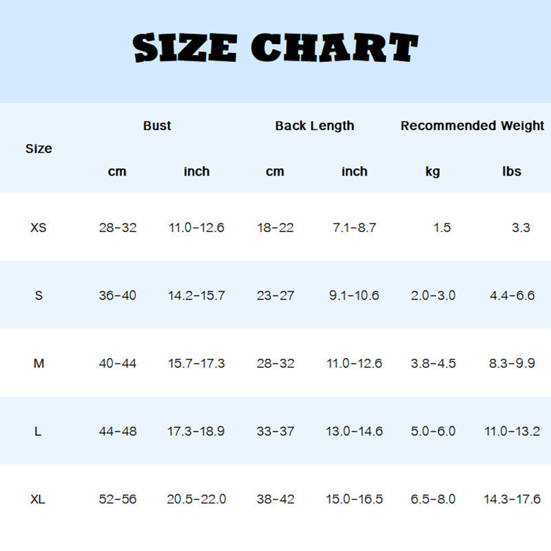 サイズ選びは胸囲と背丈を優先してください。特にシュナウザー、フレンチブルドッグ、猫などの犬種では重要です。