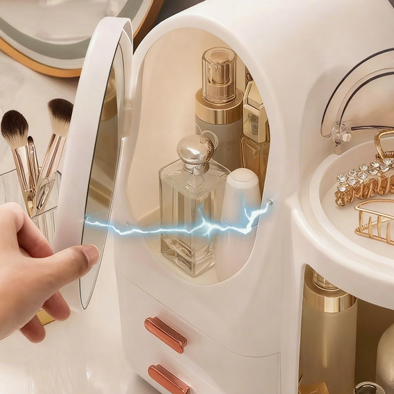 防塵・防水仕様 - 本オーガナイザーは防塵・防水設計を採用し、大切な美容アイテムを保護します。密閉構造により製品への埃の付着を防ぎ、水しぶきから守ります。これにより衛生状態を保ち、化粧品やスキンケア製品の品質を維持。清潔な保管環境を実現します。